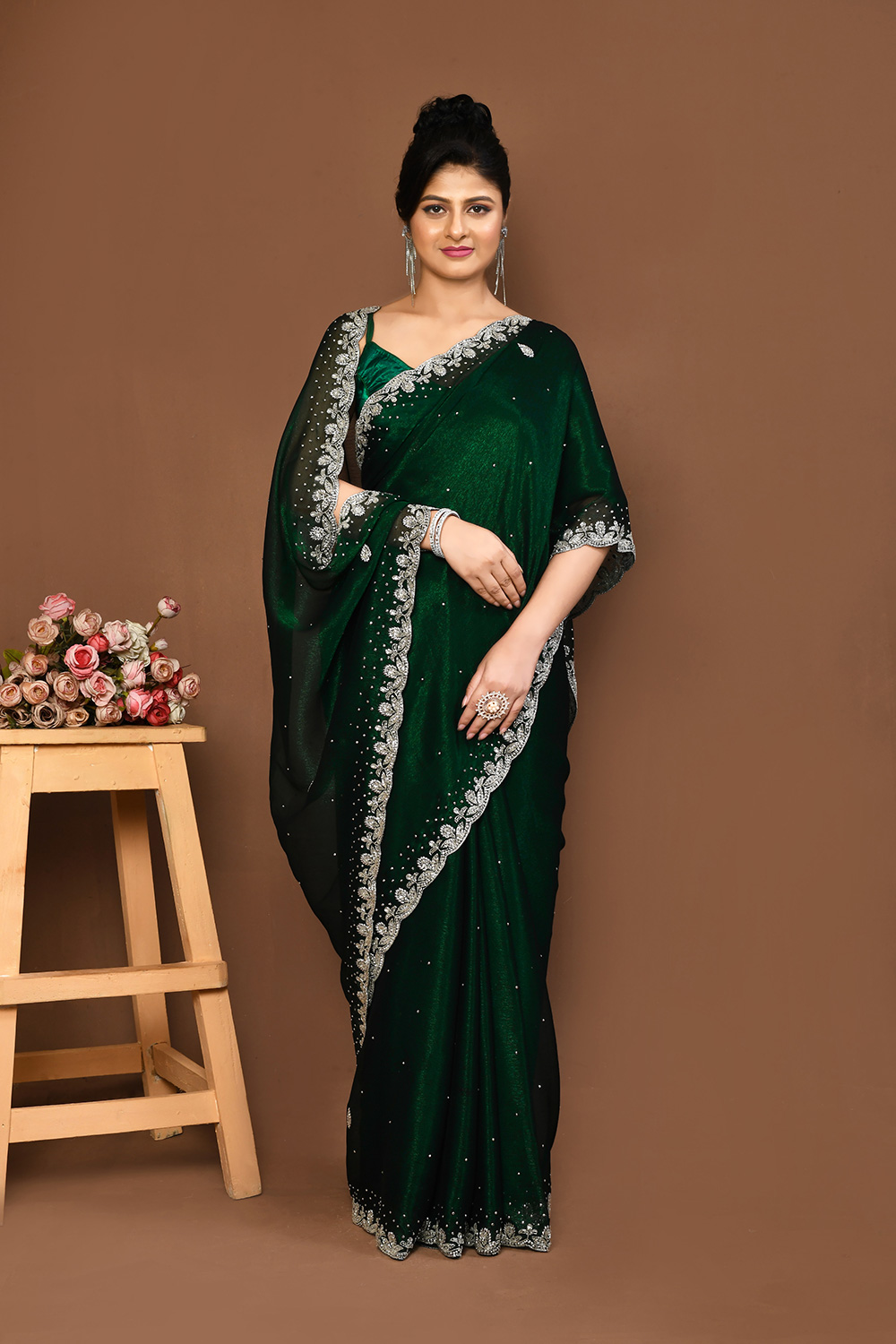Designer Work With Stone Green Colour Georgette Saree